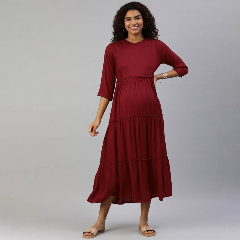 Women Maroon Solid Maternity Nursing Maxi Dress